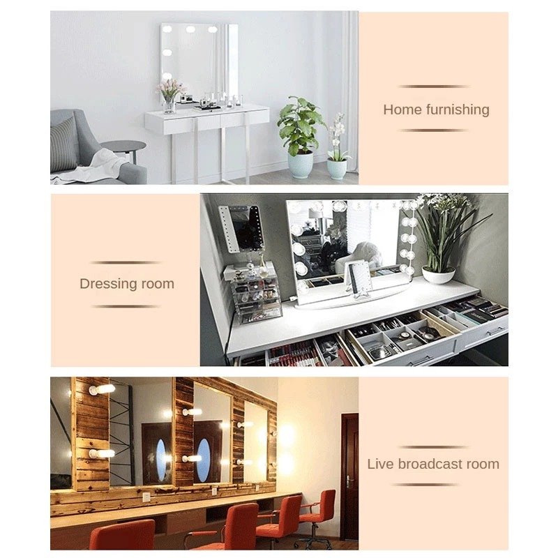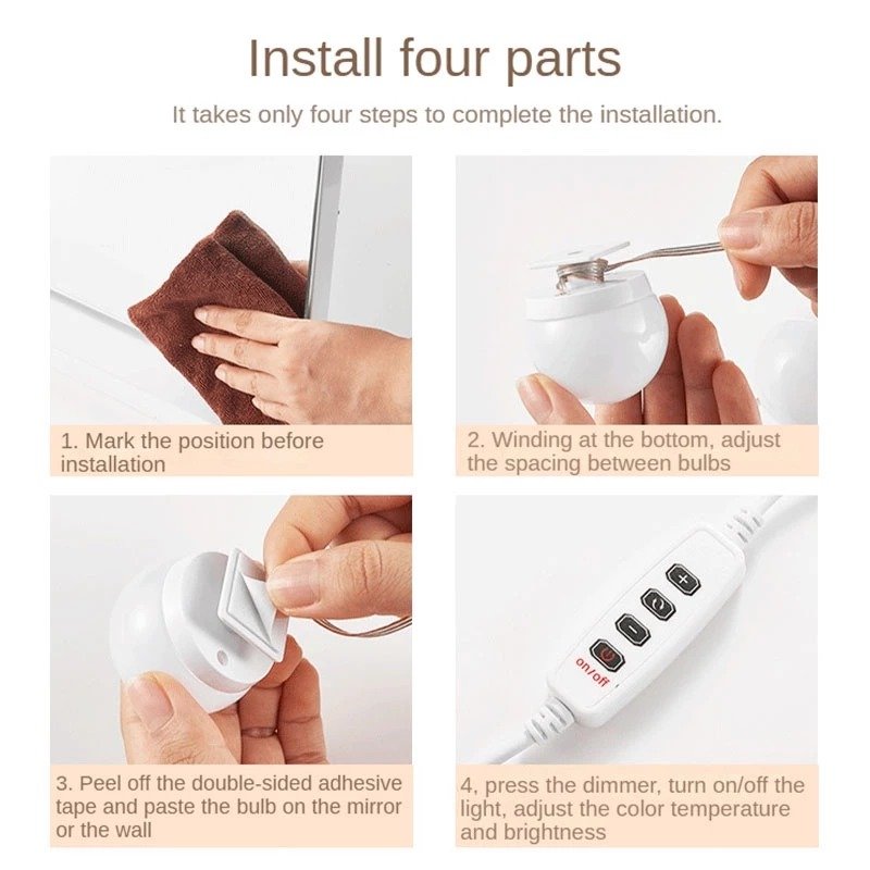 Installation is simple and tool-free. Each bulb comes with strong double-sided adhesive tape, allowing you to stick the lights directly onto your mirror frame or wall without drilling or damaging surfaces. The 28cm spacing between bulbs ensures balanced lighting coverage across your entire mirror.